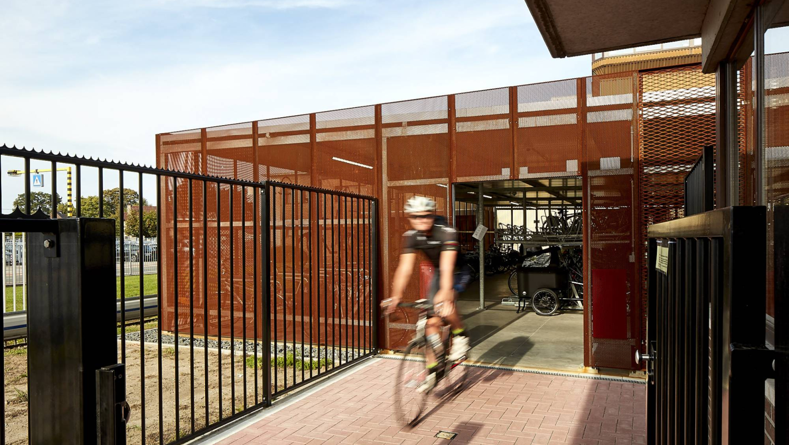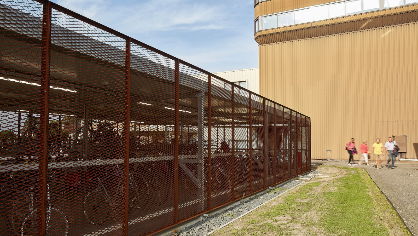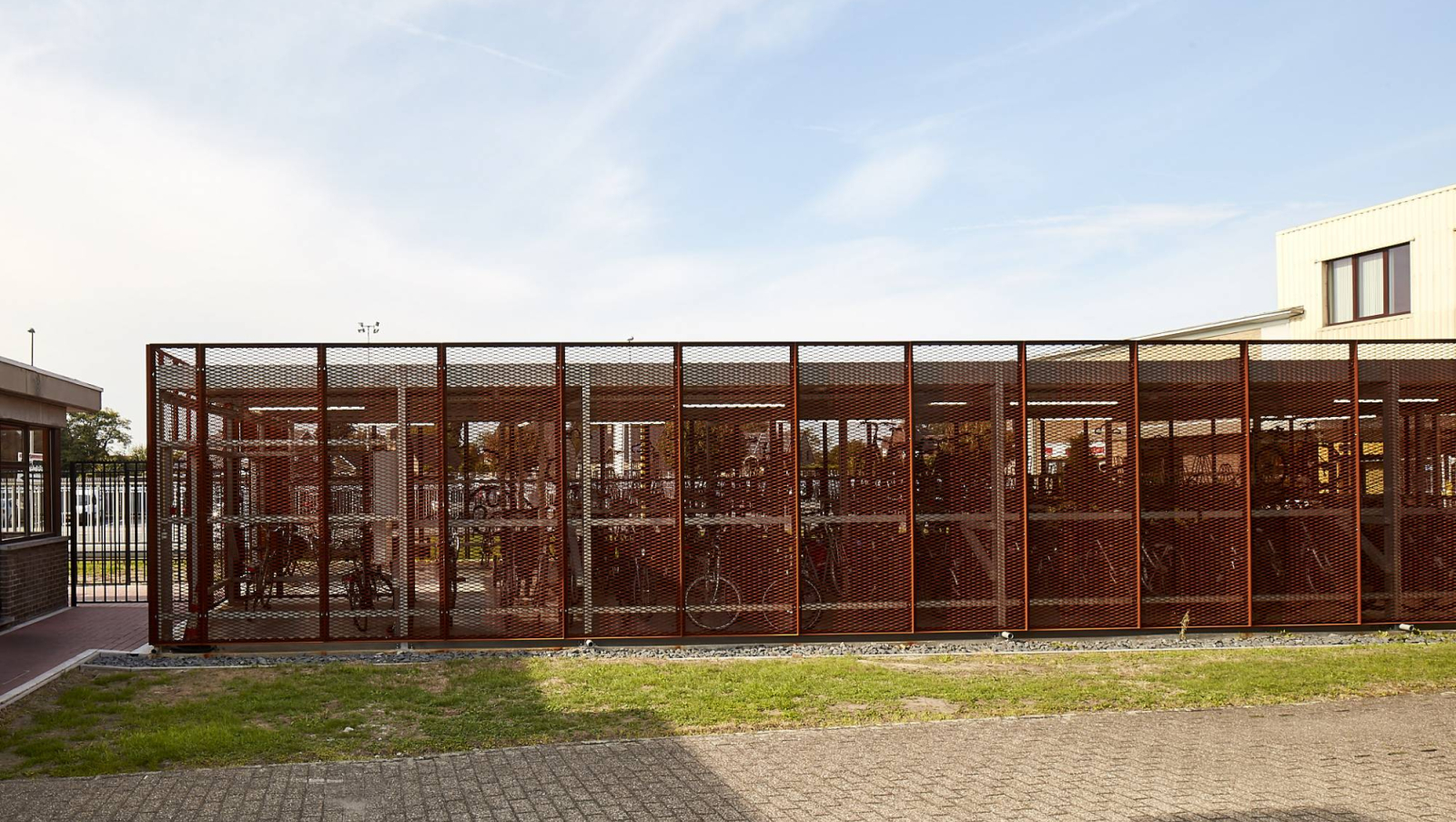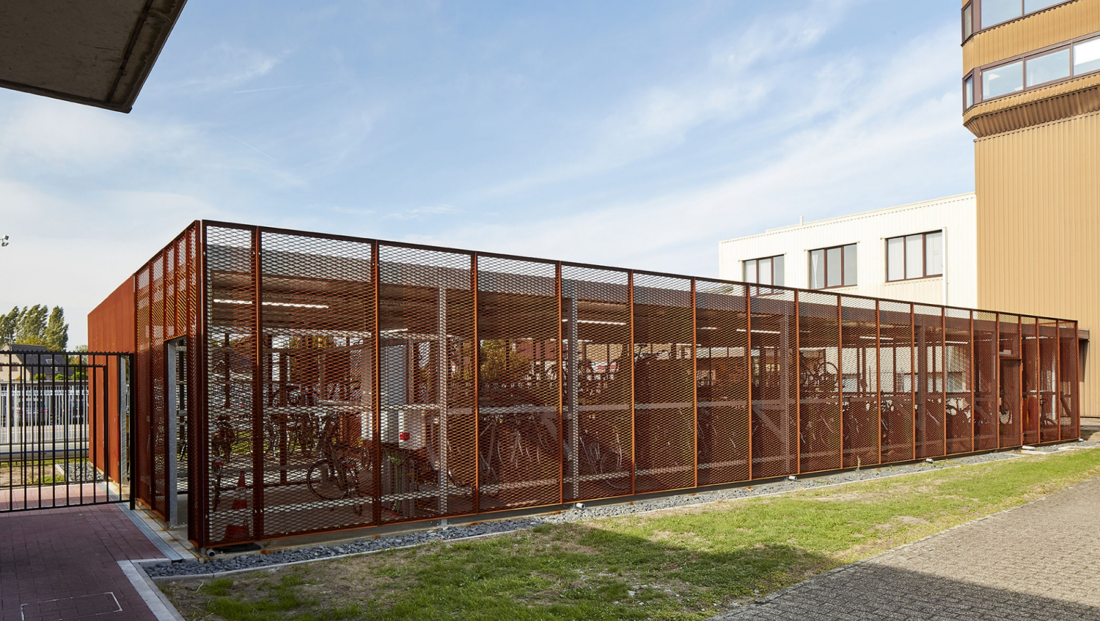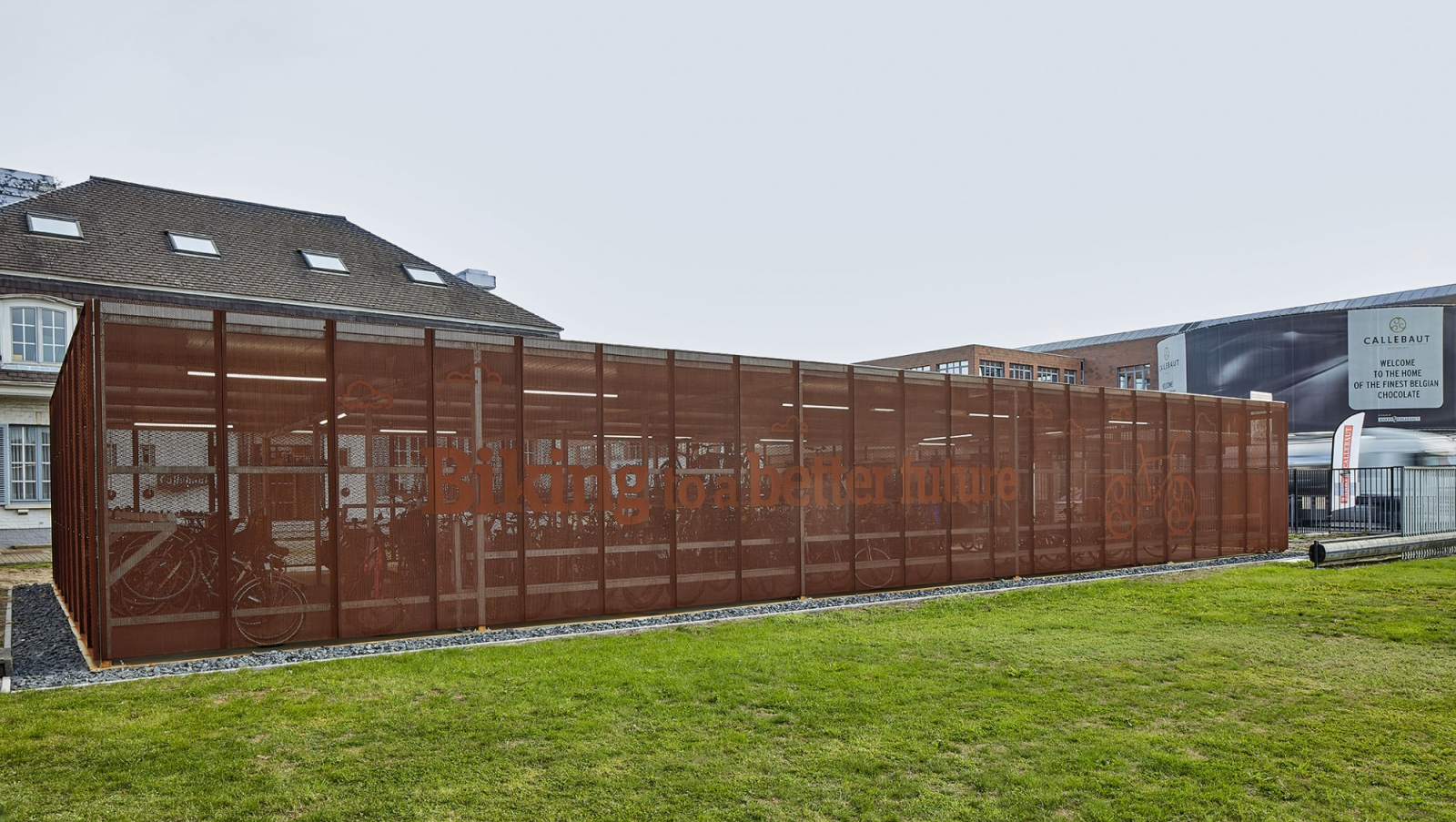 Om tegemoet te komen aan de wens van de opdrachtgever en een meer aantrekkelijke fietsenstalling te realiseren dan de klassieke standaard oplossingen, opteerden we voor een staalstructuur afgewerkt met open gevelpanelen in Cortenstaal. De roestkleur van het Cortenstaal sluit nauw aan bij de kleur van chocolade waarmee de link naar de bedrijvigheid van onze opdrachtgever gelegd is. Aan de voorzijde viel de keuze op geperforeerde gevelpanelen waarin de tekst “Biking to a better Future” werd verwerkt. Aan de achterzijde werd gekozen voor de meer open panelen in strekmetaal.